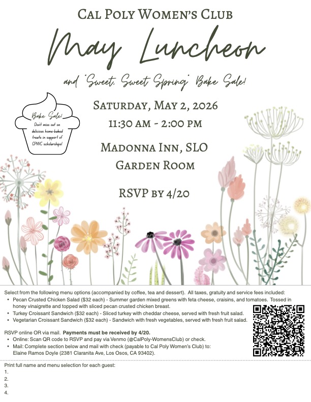 Coming up: May 2, Luncheon Invitation from Cal Poly Women's Club.